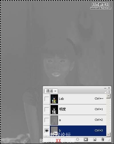 2.选择通道面板中的“a“通道,按下“Ctrl+A”全选通道内的图像,并按下“Ctrl+C”进行复制。接着选择“b”通道,按下 “Ctrl+V”进行粘贴。调整后,选择Lab颜色模式,可以发现图像的色彩上发生了变化,此时基本的糖水色调已经出来了。如图1-3、图1-4、图 1-5所示所示。