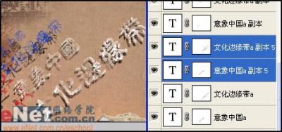 将两个文字图层同时选中,然后复制。这时将得到将图层“意象中国a副本”和“文化边缘带a副本”,图层面板如图。