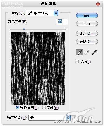 (3)执行“选择\色彩范围”菜单命令,颜色容差设置为50,容差范围内的部分变为选区,如图05所示。