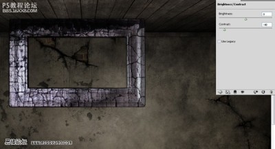 ,Step 5第五步 下一步就是在相框中添加一幅图片,创建壁画。添加海景素材进场景,调整大小,摆好位置,并适度旋转一定角度。 调整图效:亮度/对比度:26 , -30.。合并海景素材和相框。现在使用自由变换工具,(CTRL+
