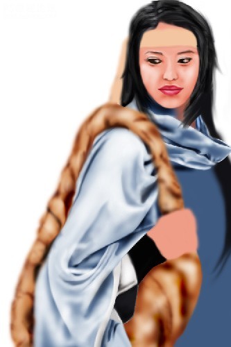 ,偶们说。。女侠虎胆之勇,所以头带和行礼都用虎皮纹理,这二个部分画起来偶是用虎皮色,然后用发刷整出毛绒质感的。